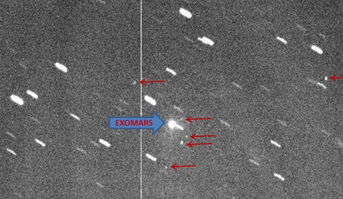 На снимките, представени от Европейската космическа агенция на на уебсайта им, където също се стичат снимки от Австралия, Бразилия, Нова Зеландия, ще забележите, че станцията ExoMars, който изглежда като доста голям ярък обект на снимката, придружавайте в пространството шест по-малки превозни средства, синхронно придвижване със земна ракета (на снимката по-долу са маркирани червени стрелки).
