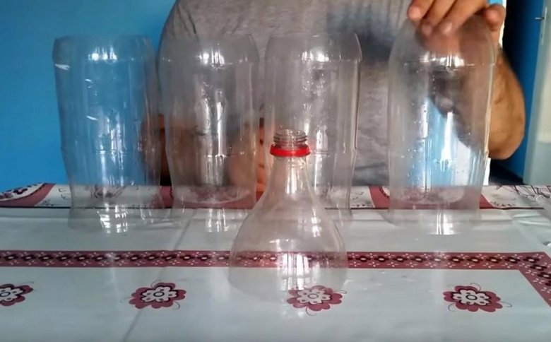И така, от четири бутилки отрязваме дъното и шията, така че до шията имаше завои най-малко 2 сантиметра. Но петата използвайте само шията със завой и малка права част бутилки (отново около 2 сантиметра).