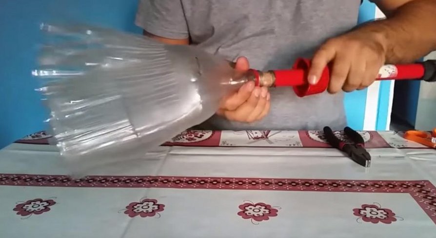 В нашия случай, разбира се, също се нуждаете от доста пластмаса – само пет двулитрови (и един и половина литър, ако имате нужда по-малка метла) бутилки на метла.