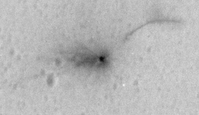 В същото време устройството остави малък кратер на Марс, а не дълбоко по-малко от един и половина метра и диаметър около два метра. това изкуствена кухина – мястото на смъртта на модула – с висока резолюция засне камера на автоматичната станция MRO HiRISE.