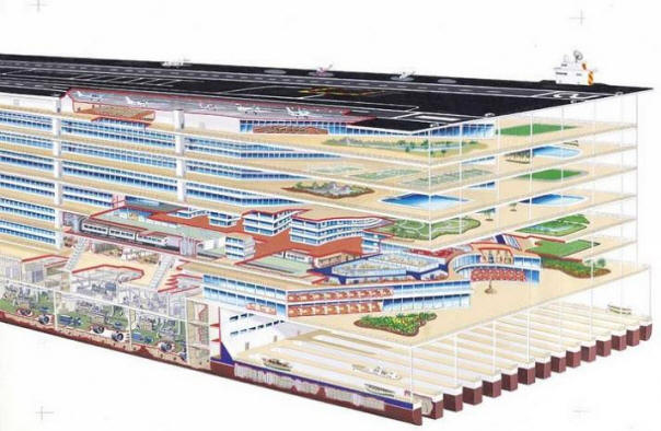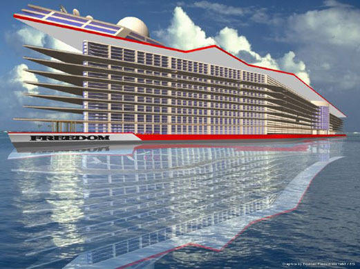 Докато овладява сушата, човек едновременно овладява водните простори. Корабите ставаха все повече и повече, морските плавания – всички по-дълго. До 21 век комфортът на пътническите лайнери достига преди невъобразими височини. Бивш мъртъв морски пехотинец Пътуването се превърна в приятно забавление. Просто вляво само една стъпка, за да направи кораба транспортно средство постоянно пребиваване. И изглежда, че тази стъпка вече е предприета. Скоро нататък на океана ще се появи огромен кораб ще живеят. Идеята принадлежи на Норман Никсън, собственик на компанията. „Инженерни решения“. Първоначално корабът е бил планиран като гигантски круизен кораб, но вече в процес на разработване на проекта Никсън получи идеята да промени концепцията и да се обърне кораб в плаващ град. Амбициозен проект, наречен „Кораб на свобода“ (Ship Ship). За изпълнение на плана беше Създаден е Freedom Ship International. Размери на кораба са невероятни. Дължина – повече от километър (1307 м), ширина – 300 метра, общо тегло – 3 милиона тона, водоизместимост – 2,7 милиона тона. 25 палуби на която ще има всичко за живеене, работа и релакс: ресторанти и барове, компютърни стаи и казина, стадиони и басейни, кортове и киносалони. 100 000 души ще живеят в града едновременно, от които 80 000 са пътници, а 20 000 са обслужващият персонал.