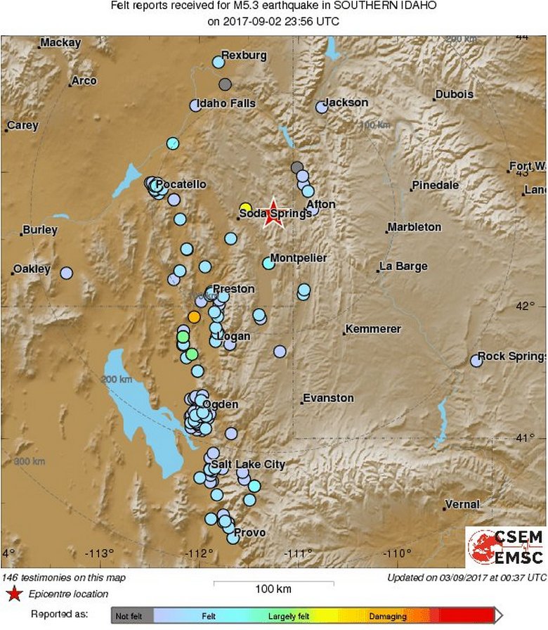 Според Геологическата служба на САЩ (USGS), в Айдахо два сериозни сеизмични сътресения, записани при 4.3 и 5.3 точки по скалата на Рихтер, последван от по-бели светлинни последствия сила малко по-малко от 4 точки. Местните жители съобщават, че това земетресението беше много забележимо, въпреки че не ги причини беда.
