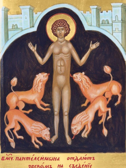 Императорските лечители не биха могли да помогнат на умиращия по никакъв начин, но Пантелеймон го върна към живота. Тогава Максимилиан се ядоса и заповяда да предаде християнския лечител на жестоки мъки. Пантелеймон изгорели свещи, навити колела, залят с горещ калай, хвърлени вътре морето с камък на врата – но той остана невредим и не отстъпи от вяра. Императорът наредил да бъде разкъсан на парчета от дивата природа. животни, но те не докоснали светеца и започнали да ближат краката му.