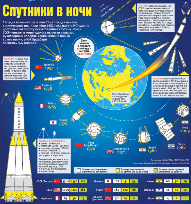 снимка от открити източници Днес целият свят бележи началото на космоса ера. Точно преди 55 години ракетата R-7 изстреля от Байконур с първата изкуствен спътник на Земята на борда. Подготовката за изстрелването беше в ход. в изключително кратко време. Сергей Королев дори измести началната дата на няколко дни по-рано, за да изпревари САЩ с гаранция. – Дежурни пожарните отряди приемат готовност номер едно. Запалване. Предварителен. Основното нещо. Възходът. 1957 година. Провежда се в Москва Международен фестивал на младежите и студентите, опитващи Хрушчов отстраняват генералния секретар и Джон Ленън се среща с Пол Маккартни. Съветският съюз започва космическата ера, като стартира първата изкуствен спътник на Земята. „Предаваме важно съобщение на TASS. 4 Октомври 1957 г. в Съветския съюз е направен успешен старт първият в света изкуствен спътник на Земята “, – с тези думи младият диктор на Държавното радио и телевизия Игор поздрави публиката Кирилов. Това беше първата победа в конфронтацията на две космически правомощия. Тя започна през 1955 г., когато президентът на САЩ Дуайт Айзенхауер каза: „След 2 години САЩ ще пуснат първата изкуствена луна. “Така американците нарекли сателита си. Съобщение от чужбина, възприемано като предизвикателство. Отговорът веднага последва: точно там одобри специална комисия за разработване на съветската програма изкуствен спътник на Земята.