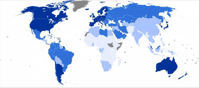 Страни по индекс на човешкото развитие: тъмно синьо – по-развито, светлосиньо – по-малко