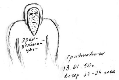 Изглеждаха много странно … По-ниско от очевидец, растеж – те едва достигнаха носа му (1,5-1,6 м, евентуално 1,7 м), защо трябваше да ги гледам като че ли отгоре надолу. Те бяха облечени в яркозелени (сякаш светещи) гащеризони, оставяйки отворено само лицето. Главите са поставени дълбоко, без врата раменете, сякаш са започнали на нивото на ухото. Помня само как гостите погледнаха до кръста, около втората половина на тялото очевидец не е нищо не можех да си спомня. Лицата могат да бъдат сбъркани с обикновения човек ако не за редица подробности …