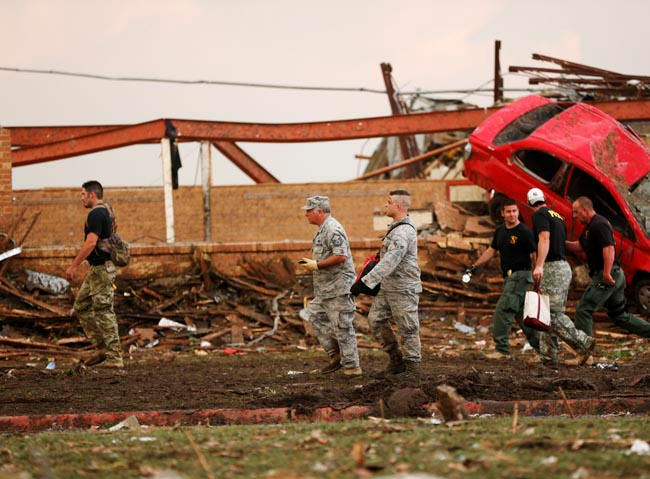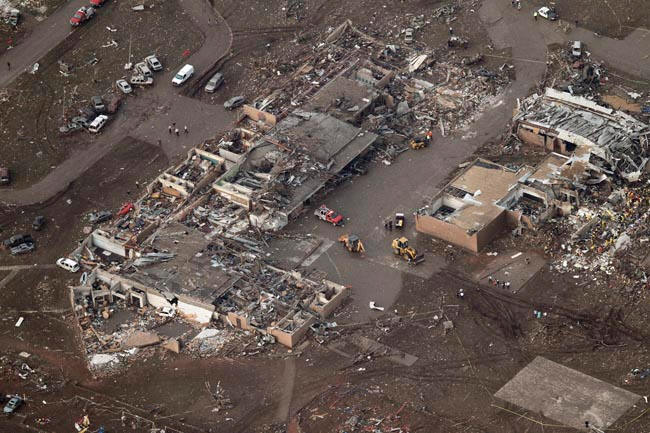 Удар на торнадо удари Големите американски равнини, чиито територии са населени до 60 милиона души. торнадо са част от гигантска буря, образувана от буря територии на Тексас, Арканзас, Канзас, Мисури, Оклахома и Айова. Метеоролозите преброиха 50 торнадо за по-малко от два дни, някои от тях от които е достигната мощност на F-4, което е с една стъпка по-малко от най-високото възможно торнадо до момента. Според Национална метеорологична служба на САЩ, торнадота в широки мили (1.6 км) почти напълно унищожи предградието на град Оклахома, град Мур. И така, торнадо унищожи училищната сграда, в която имаше 75 третокласници Някои деца намериха убежище в училищния коридор спасители съобщава за 20 мъртви деца. Разпитът продължава. “Много сградите изглеждат така, сякаш са взети заедно с всичко, което е било в тях, поставени в гигантски пасатор, смиламе за няколко минути, а след това изсипаха всичко на земята “, цитира ABC News Джон Уелч, пилот на хеликоптер, работещ в Мур. В полицията съобщават, че унищожаването е довело до множество пожари.