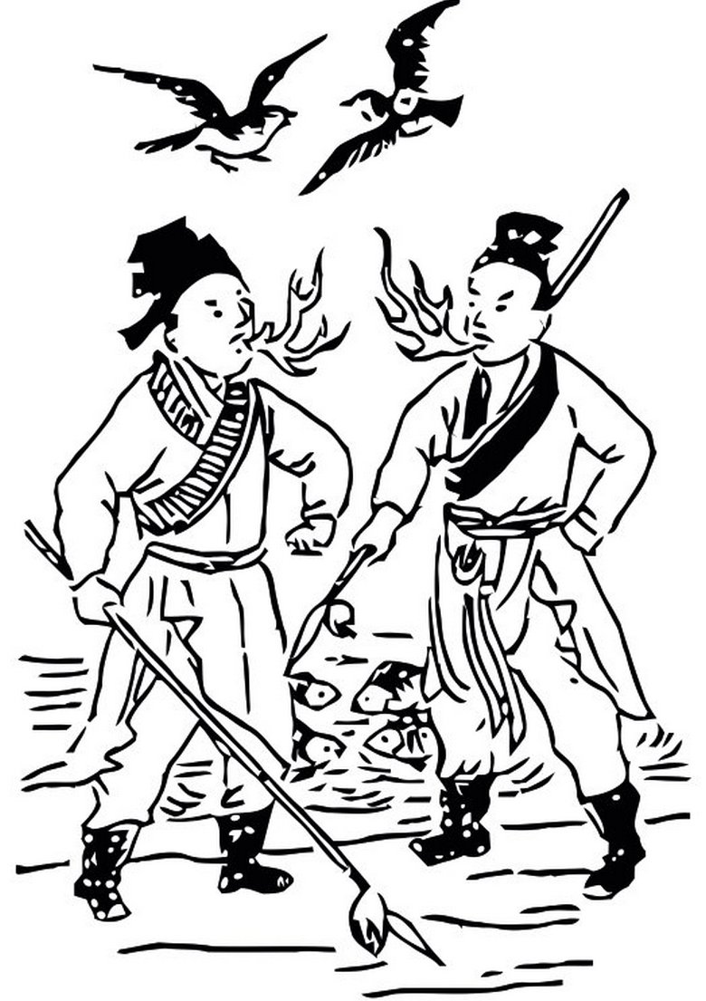 В този случай преводачите се интересуват от останалите “карти”, в 56 от тях (виж по-долу) изобразяват двама войници, олицетворяващи два континента. Между тях е океанът, в който рибата се разнася (това е флотът). Птиците се бият в небето (самолети). Стихотворение към тази рисунка уж обяснява, че сблъсъкът в случая не зависи от това войник, това е технологична война между Изток и Запад, където гъбата е отгоре и отдолу е огън.