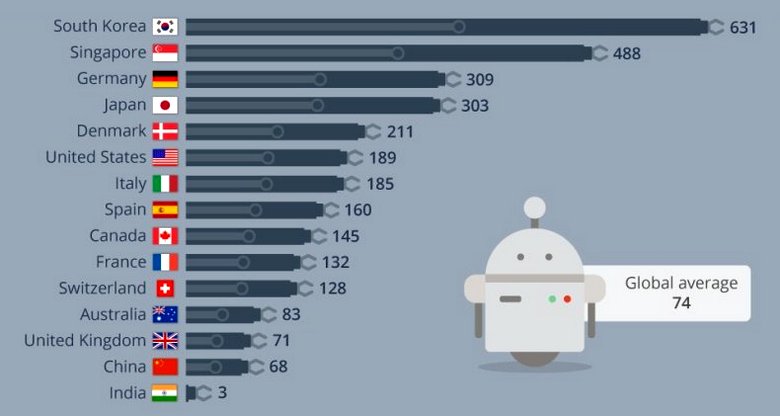 „Международна федерация по роботика“ публикува друга данни, свързани с автоматизация и роботизация на производството предприятия в най-развитите страни на света. В момента (без да се взема предвид текущата година, която със сигурност ще демонстрира повече по-високи проценти) на 10 хиляди души, работещи в тези сектори отчита 74 робота, докато преди година тази цифра беше само 66 единици.