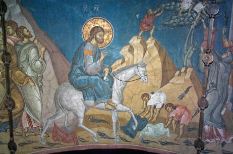 Трима от евангелистите пишат, че Исус, приближавайки се до града, даде указания докарайте двама млади ученици магаре, което никой досега седна, в друго Евангелие (Йоан) само споменава че Христос, като намери младо магаре, седна на него. И така, на магаре, Исусе Христос влезе в Йерусалим и хора, които вече знаеха това в навечерието на чудото на възкресението на праведния Лазар, тържествено поздрави Исус и разпространи своето по пътя Му дрехи и палмови клони, изрязани от дървета.