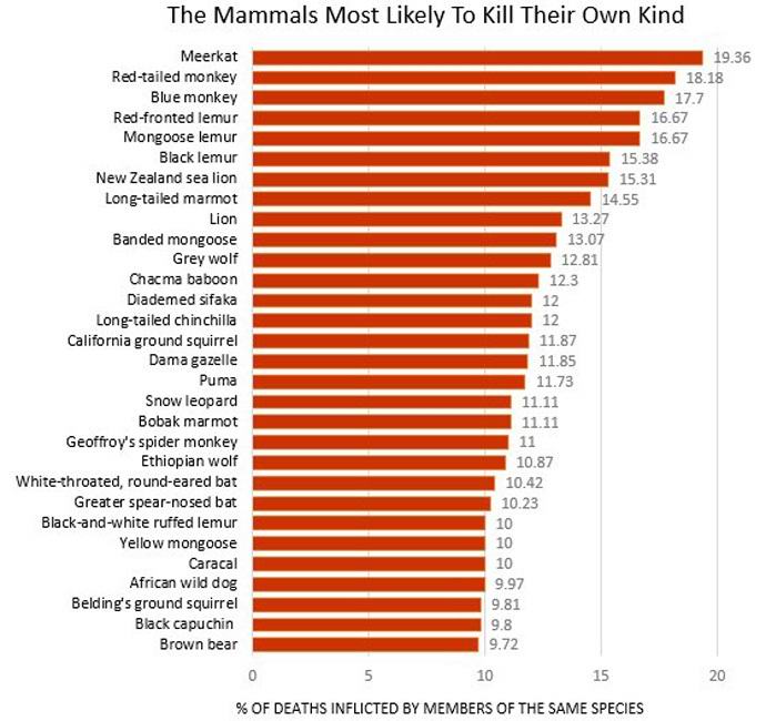 Кой би си помислил, че най-жестокият бозайник в света ще бъде meerkat – животно от семейството на мангустите, което живее в Южна Африка. Според експерти, тези сладки малки животни, любящи стойката на задните крака просто изглежда сладка и безвреден. Всъщност всеки пети мееркат умира, ставайки жертва на собствения си родственик.