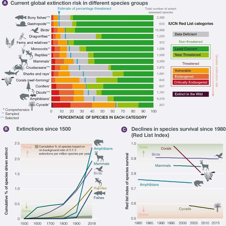 Според експертите около 75% от сушата, 40% от световните океани и 50% от реките и езерата вече са претърпели известна степен на деградация по вина на нашата цивилизация. Застрашени са повече 40% земноводни, около 33% от рифовите корали и над 35% от морските бозайници. Точните данни за насекомите обаче все още не са налични някои експерти предполагат, че изчезването заплашва да поне 10% от тях, например, пълно изчезване заплашва пчелите, без които светът около нас ще стане не само по-бедни, но и по-малко щедри за нас по отношение на храната.