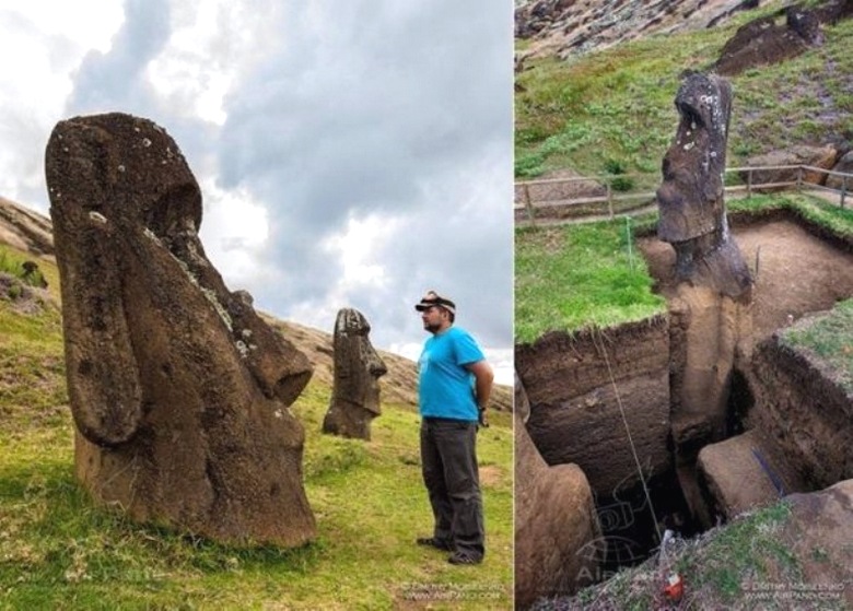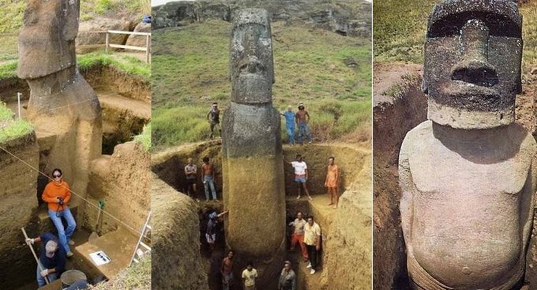 Тогава археолозите решиха да изкопаят статуите – и се оказа, че това повечето от тях не са само глави, но пълни фигури, заровени в земята (поредната загадка). Вярно я учените „предположиха“ много бързо, казват те, идолите бяха бомбардирани времеви вулканични и утаечни отлагания. Между другото, с разкопаване на пълни фигури (гледайте видео) неуморни търсачи антики дори намериха фрагменти от някакъв механизъм, че те са тук те го смятаха за многотонно устройство за преместване на камък статуи.