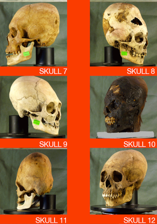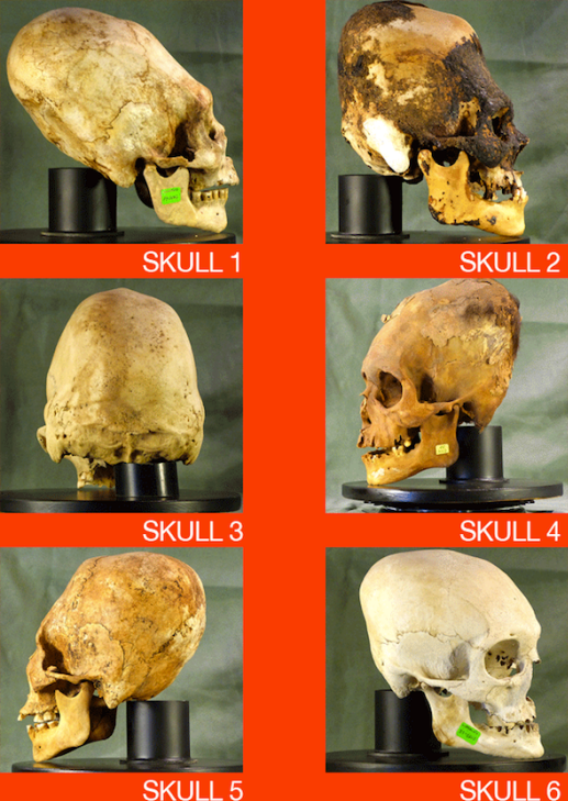 Снимки от открити източници Като цяло Тело намери около 300 от тях черепи, които трябва да са на възраст около 3000 години. Наскоро на един от беше извършен ДНК анализ на черепите. Експертът Брайън Фостър даде малко предварителна информация относно тайнствените черепи. В по-голямата си част удължените черепи са резултат от умишлено деформации на черепа чрез обвързване или сплескване на главата и излагане на него за дълго време. това постигна ефекта, превързвайки главата между две дъски, или дърпайки главата си заедно с кърпа. Този метод естествено промени формата си. черепи, обаче обем, тегло и други присъщи характерни черти човешкият череп остана непроменен.