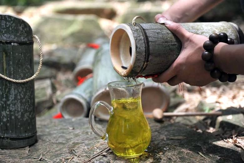 Процесът на “получаване” на готов алкохол е интересен. клиенти често канени да видят колко различни секции от бамбукови стволове, определящи къде се съдържа ценната смес, и след това пробийте малка дупка, за да може да се разлее в стъклен съд. Ликьорът е готов за пиене на местно ниво, но ако някой иска да го вземе, за да направи впечатляващ подарък, той може да избере бамбуково коляно под формата на вид дървена бутилка (вижте видеото по-долу).
