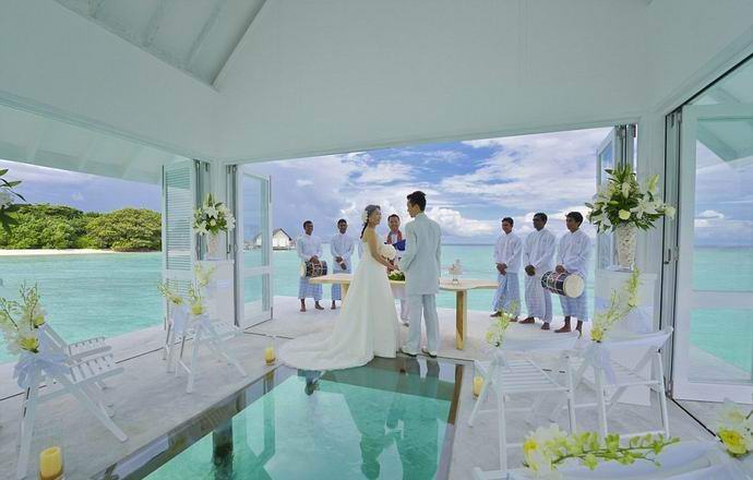 Луксозен курорт, наречен “Landaa Giraavaru”, предлага младоженци и булки да станат съпрузи директно в Индийския океан, отиване до олтара в възхитителен параклис с прозрачен под. Пътеката до сватбения павилион е не по-малко живописна – да се стигне до него, първо трябва да отидеш на плажа, а след това да плуваш за около четиридесет минути на дървена лодка, която дори повече има любовници романтично настроение.