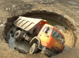 На спонтанния паркинг на ул. Правдинская кола, натоварена с пясък, падна под земята. под него изведнъж се образува яма с правилна кръгла форма с диаметър около 7-8 метра.