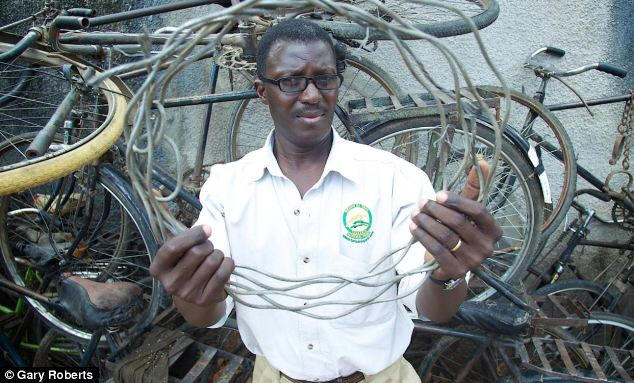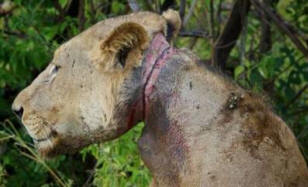 В Танзания Гордостта на лъвовете се грижеше за младите в продължение на три години. човек, който бавно умираше поради метални пръти, с детството му окова врата.