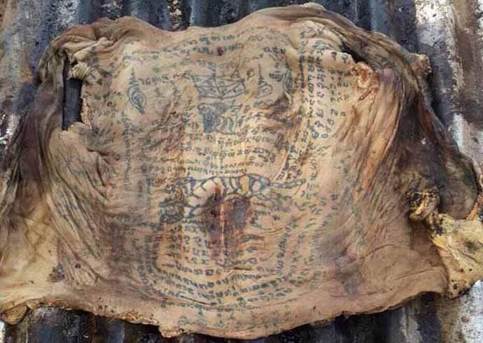 Работниците откриха много татуировки върху кожата на починалия, представящи неразбираеми надписи, рисунки и рисунки. как по същия начин се оказа, че останките са изгнили почти до костта, обаче, кожата беше в отлично състояние – не е засегната от гниене? Суеверните тайландци са убедени, че са тайнствени татуировки ръчната работа на някакъв магьосник и служи за изработка кожата е неуязвима за всякакви повреди, както и гниене.