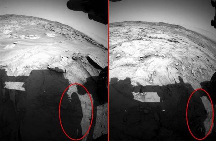 Например, известният онлайн археолог Скот Уоринг онзи ден намерих сянката на астронавта в близост до роувъра на Curiosity Rover. Освен това тази сянка се отразява не в една, а веднага в четири снимки, които не могат да бъдат злополука или дефект на снимката. Освен това, както Варинг пише в коментара си към снимките, публикувани в мрежата, това не е първият път, когато астронавт, или мениджър, или ремонт роувър, случайно попада (или по-скоро сянката му) в Обектив на камерата на Mars rover. Това беше вече преди две години …