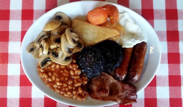 Британците закусват късно, но старателно. По това време те яжте яйца, бекон, гъби, черен пудинг, боб, домати, колбаси и тостове.