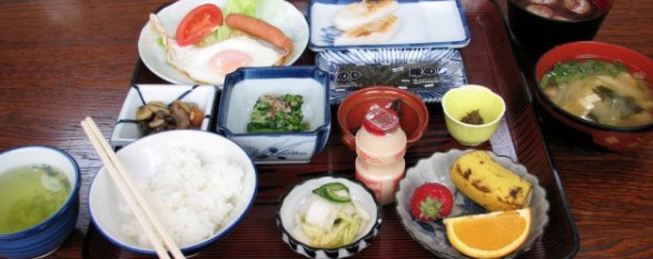Японската закуска трябва да бъде разделена на традиционна (мисо супа, ориз, нори водорасли) и западна (кафе, яйца, препечена филийка с масло, картоф салата).
