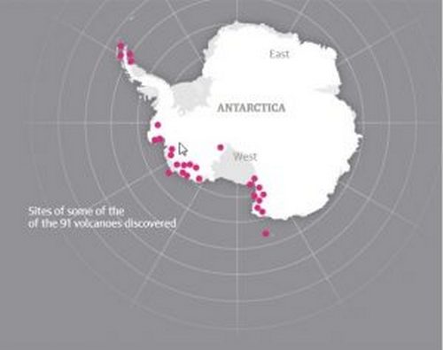 Повторен анализ на ледения континент беше извършен с използване теглени радари на превозни средства и самолети, след което получените данни се сравняват с геоложка информация на други въздушни проучвания и спътници. когато Обширни данни бяха събрани в една снимка и обработени на компютри, оказа се, че в Антарктида са още повече деветдесет спящи вулкана, всички те (и стари, и нови) са високи от 100 до 3800 метра и сега са покрити с лед, достигащ 4 километри дебелина. Освен това всички върхове са съсредоточени в западния система на континенталния риф, простираща се на 3500 километра от Антарктически леден шелф до Антарктида полуостров.