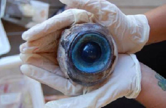 Мъж, разхождащ се по плажа в Помпано, Флорида (САЩ), откри гигантско око. Спасителната служба, която той повика, в своята първо, поиска присъствието на морски биолози от Комисията на защита на рибата и дивата природа Флорида, но също и тези, които се намират задънена улица. Сега тайнственото око ще бъде насочено към Флорида Институт за изследване на рибата и дивата природа в Санкт Петербург. Там ако имат нужда дори от генетичен тест. по-рано смята се, че окото най-вероятно принадлежи на рибата, може би редки и слабо проучени дълбоководни видове. Как се озова брега във Флорида, учените не могат да кажат.