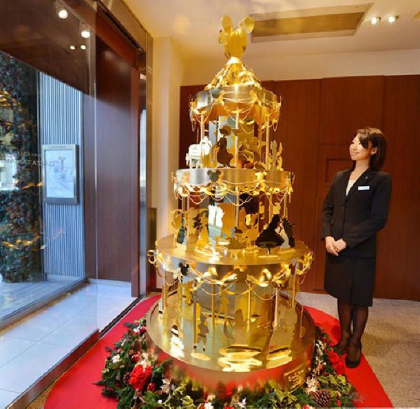 Японският бижутер Гинза Танака изненадва обществеността от няколко години тематични коледни шедьоври. Например през 2007 г. той хвърли 20 кг злато Дядо Коледа и година по-късно се появи златно дърво на стойност над $ 1,5 млн. Тази година Tanaka надмина себе си. В началото на декември в магазина му се появи коледно дърво, създаването на което отне около 40 кг благороден метал. Прилича повече на дърво, отколкото на дърво. многостепенна въртележка. Вместо коне – 50 екшън фигури Карикатури в Дисни: Пепеляшка, Малка русалка, Пинокио. И разбира се Мики Маус: Танака отдавна не е безразличен към този герой и вече се справи преди няколко години да направя златно копие от него.