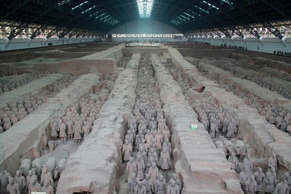 Около 8000 теракотни воини бяха погребани близо мавзолеят на първия император на Китай, Ци Ши Хуангди. статуи теракотовите воини са умело направени пешаци, стрелци, кавалерия, колесници и пр. Ново историческо проучване дава причина да се каже, че в основата на стила на тези скулптури беше Взето е древногръцко изкуство. Находката на теракотни воини е станала значимо археологическо събитие на 20 век. Армия от статуи в в натурален размер е погребан до първия император Китай. Историческите документи сочат, че императорът Цин Ши Хуангди се възкачи на престола през 246 г. пр.н.е. приблизително по същото време започна работата по неговото бъдеще помпозен гроб близо до Сиан (Китай). За първи път този гроб беше открити през 70-те години. По време на разкопките му археолозите са открили хиляди реалистични теракотни статуи на музиканти, занаятчии, чиновници, войници и коне. По статуите са работили повече 700 000 души, много от които са били осъдени или имаше някакви дългове към държавата. Цел на този масивен събитието беше да осигури императора в отвъдния живот необходими ресурси и военна мощ. Като част от този проект скулптори и занаятчии за създаване на реалистични войски в като вдъхновители използваха истински хора, облечени броня и оборудвана с копия, мечове, арбалети. Въпреки това дълго време учените не можаха да разберат как са правени древните оръжия теракотни войски. Експертите предположиха, че са арбалети направен от бамбук или дърво и тъй като дървесината отдавна е разпадала, запазени са само накрайниците и спусъците за лъковете. Без износване металните части предполагат, че това оръжие не е било използван в истинска битка, това означава, че е направен изключително за погребение, сигурни са експертите. В допълнение, чрез анализ на местата, където са намерени оръжията, както и чрез изследване на промените в размера и формата на неговите елементи, учените предполагат, че блокиращите части на изстрелването на арбалетите бяха отливани в еднакви форми и се произвеждаха на малки партиди. Също и оръжия теракотовата армия беше изключително развитие, което не беше така използва се за други цели и не се пуска в потока на производството. Организацията на работата по производството на тези оръжия се основаваше на структурата на обществото в древен Китай. Привилегиите се прехвърляха по това време по вид. А останалото население беше разделено на малки групи, чиито членове бяха колективно отговорни според имперските законите. Тоест, ако някой от някоя от тези групи се е ангажирал престъпление, членовете на групата имаха избор: да изправят извършителя пред съда, т.е. или всички заедно да бъдат наказани.