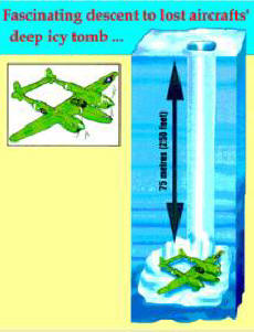 Рано сутринта от тайната база на ВВС на САЩ, разположена в Гренландия, Шест изтребителя P-38 Lightning и двама гигантски бомбардировач B – 17. Беше на 15 юли 1942 г. и самолети се отправяха към британско летище, за да участват битки срещу фашистката армия. Самолети прелетяха над полярната лед на изток, когато паднаха в виелица. Те летят сляпо те чу, че първата им планирана спирка в Исландия за зареждането е отменено. Това ги накара да оглавят обратно към базата. Наближавахме базата с малък запас от гориво, откриха, че също е затворен. Пилотите разбраха, че те не остава нищо друго, освен да се счупи в ледената шир Източно крайбрежие на Гренландия. Аварийно кацане P-38 s прибраното шаси беше единственият изход от тази ситуация. По време на кацането носовото колело на първия самолет удари пукнатина в ледника, което кара самолета да отскочи. K за щастие, удар по фенера на пилотската кабина на осемтонен самолет P – 38 омекотен от сняг, а щетите на пилота бяха незначителни. След успешно кацане на първия самолет, останалите членове ескадрилите започнаха да намаляват, премахвайки шасито. В резултат на кацане самолетите бяха леко засегнати. Всички членове на ескадрилата оцеляха и здрав и след около 10 дни бяха спасени. Все пак самолети бяха оставени на мястото за кацане. Изминаха 1 година и няколко души случайно си спомних легендарния ескадрон за изгубени. Но само в 1980 г. започва да говори за спасяване на самолети. американски търговецът на самолети Патрик Епс каза на приятеля си Ричард Тейлър, че самолетите трябва да са като нови. „Всичко, от което се нуждаем ще направим, че изстържете снега от крилата, запълнете ги гориво, олово и издигане в небето. И нищо повече. “Тези двама Отнеха много години и много пари, за да се изпълни мисията. това е бяха предприети няколко експедиции и едва след това станаха поне нещо се знае. През 1988 г. исландски геофизик с С помощта на сложен радар открих осем големи обекти. Като малка, домашна парна сонда направиха дупка в леда, членовете на експедицията гледаха с изненада, как сондата трябваше да удължава през цялото време. Накрая, на дълбочина 75 метра е намерен първият самолет!