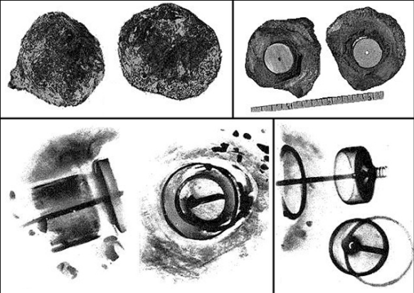 Рентгеновата снимка показва, че в горната част на металния прът опира до нещо, наподобяващо малка изворка. Това позволи приписват обекта на електрически механизми.