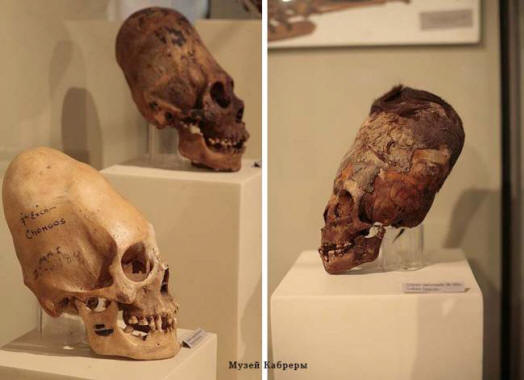 Снимки от открити източници Боговете на Египет също носеха удължено шапки. Има версия, с която дори всички познават статуите Великденските острови са фигури с удължени черепи и техните червените каменни плоски шапки всъщност изобразяват дълга коса, положена в сложна прическа, която покрива главата. Учените говорят за изкуствени деформации: o механично въздействие върху главите на децата за ритуални цели. тези ефекти в детството и даваше, сякаш, желаните черепи оформят. Но размерите на черепите не корелират добре с тази версия, намерени в древни погребения. В крайна сметка, в тези странни черепи беше поставен мозък с тегло 2500 и дори 3500 грама. И това много повече от нормалното тегло на мозъка. Средно тегло човешкият мозък е около 1500 грама. Имайте предвид това обемът на черепа и интелектуалните способности на човек не го правят са свързани помежду си. Например писателят Анатол Франц имаше мозък с тегло 1017 грама. Но мозъкът на Тургенев претегля 2012 г. грама.