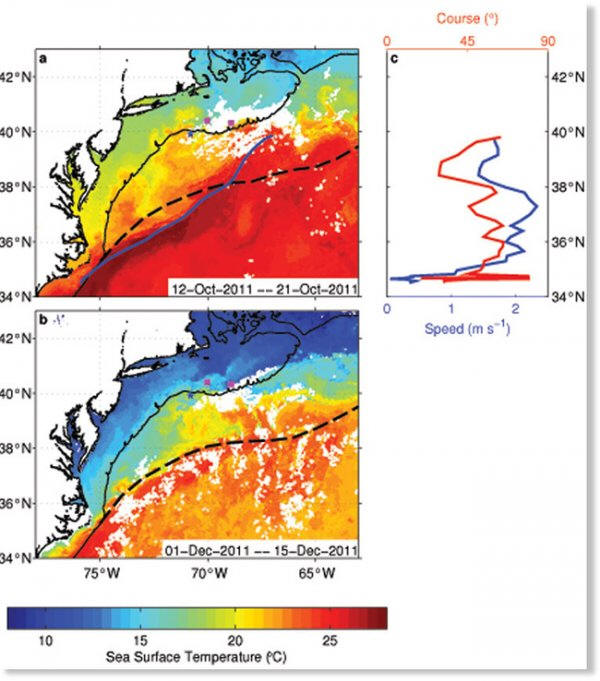 Океански води около континенталния шелф на Нова Англия се оказа по-топло от нормалното поради промени в обичайния курс Гълфстрийм, който възниква преди около година. Започнете да учите това явление е положено от местните рибари, които са докладвали до научен институт относно техните притеснения за необичайно топлото вода на повърхността на океана и увеличени водни потоци. Така и с През есента на 2011 г. започна събирането и записването на данни по канала на Голфстрийм. В отдалечените точки на континенталния шелф – две температурен датчик. Както се оказа, водата в тези точки се е превърнала по-топло с 6.2 ° C и 6.7 ° C. Когато водата на това място на океана е такава топло (+ 18 ° C) през есента, това е повече от ненормално, казват те изследователи.