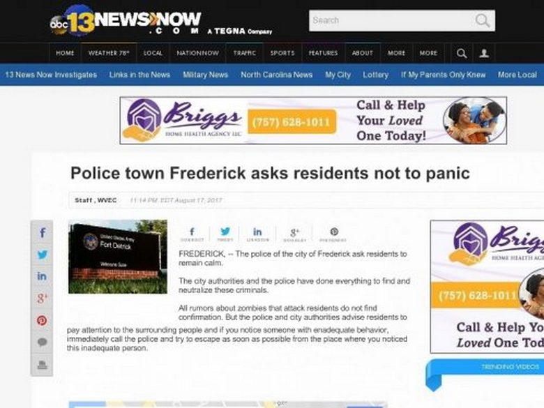 И сега ужасни репортажи от Фредерик за появата там на зомбита, които разкъсват, хапят и убиват гражданите. мрежата за този материал се появи информационна агенция abc 13 НОВИНИ СЕГА. Два часа по-късно това съобщение изчезна. Не е ли всичко странно? нали? ..