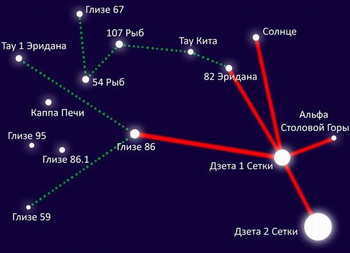 Американският ентусиаст астроном Марджидж Фиш, който живее в Охайо, Дълго време разглеждах картата на Хил, опитвайки се да намеря небесни тела, чието положение би отговаряло на чертежа. Марджъри търси звезди на петдесет светлинни години от Слънцето, както и онези светила, в близост до които биха могли да са подходящи за органичен живот на планетата. селища астрономът внезапно даде положителен резултат – оказа се, че извънземните, които бяха отвлекли Барни и Бети, можеха да летят до Земята планета, разположена в близост до бинарната система от звезди Зета-1 и Зета-2 в съзвездието Мрежа. Съществуването на тези планети в 82 Еридан и 54 Риби е научно доказан факт. Така че картата, съставен от Бети Хил, изобразява много специфичен сайт Вселената.